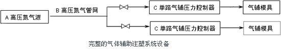完整的氣輔注塑系統(tǒng),應(yīng)由A高壓氮氣源設(shè)備、 B高壓氮氣傳輸管道C氣輔壓力控制器三部分組成。